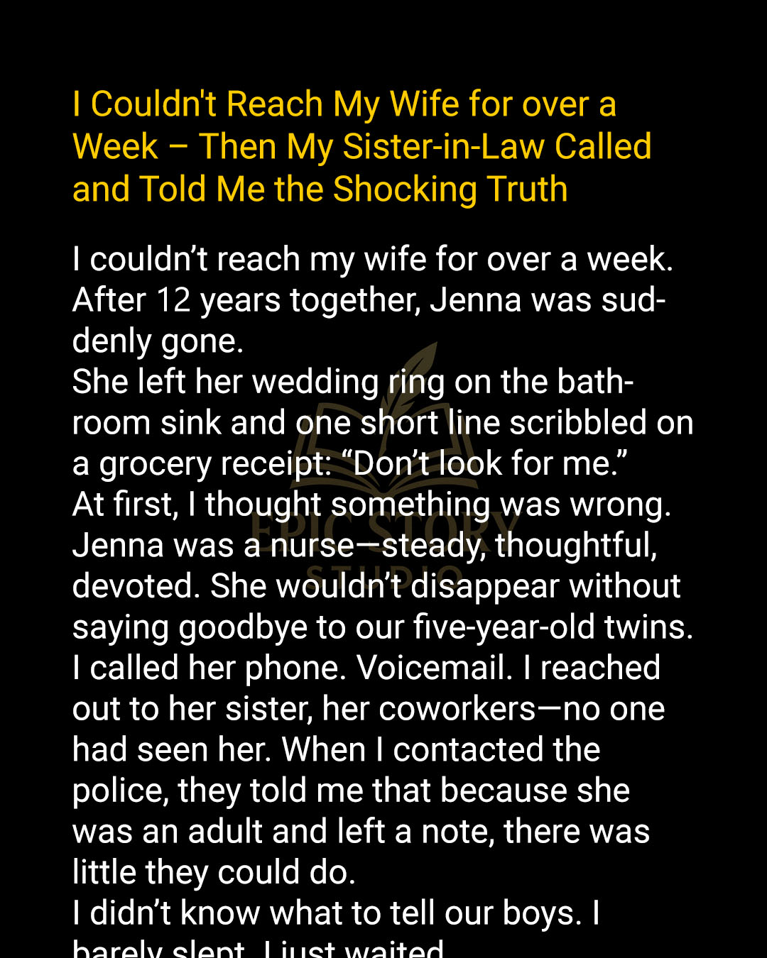 I couldn’t reach my wife for over a week. All she left behind was her wedding ring on the bathroom sink and a shaky note on a grocery receipt that said, “Don’t look for me.” I was barely holding it together when her sister called and finally told me why Jenna walked away.