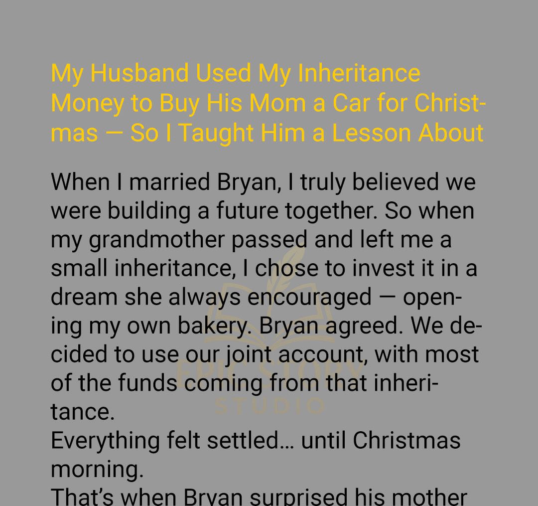 Judy’s dream of opening a bakery in honor of her late grandmother feels within reach until her husband Bryan makes a shocking move. Using her inheritance, he buys his mother a luxury SUV for Christmas. Her trust shattered, Judy faces a choice: accept betrayal or quietly take back control of her life.