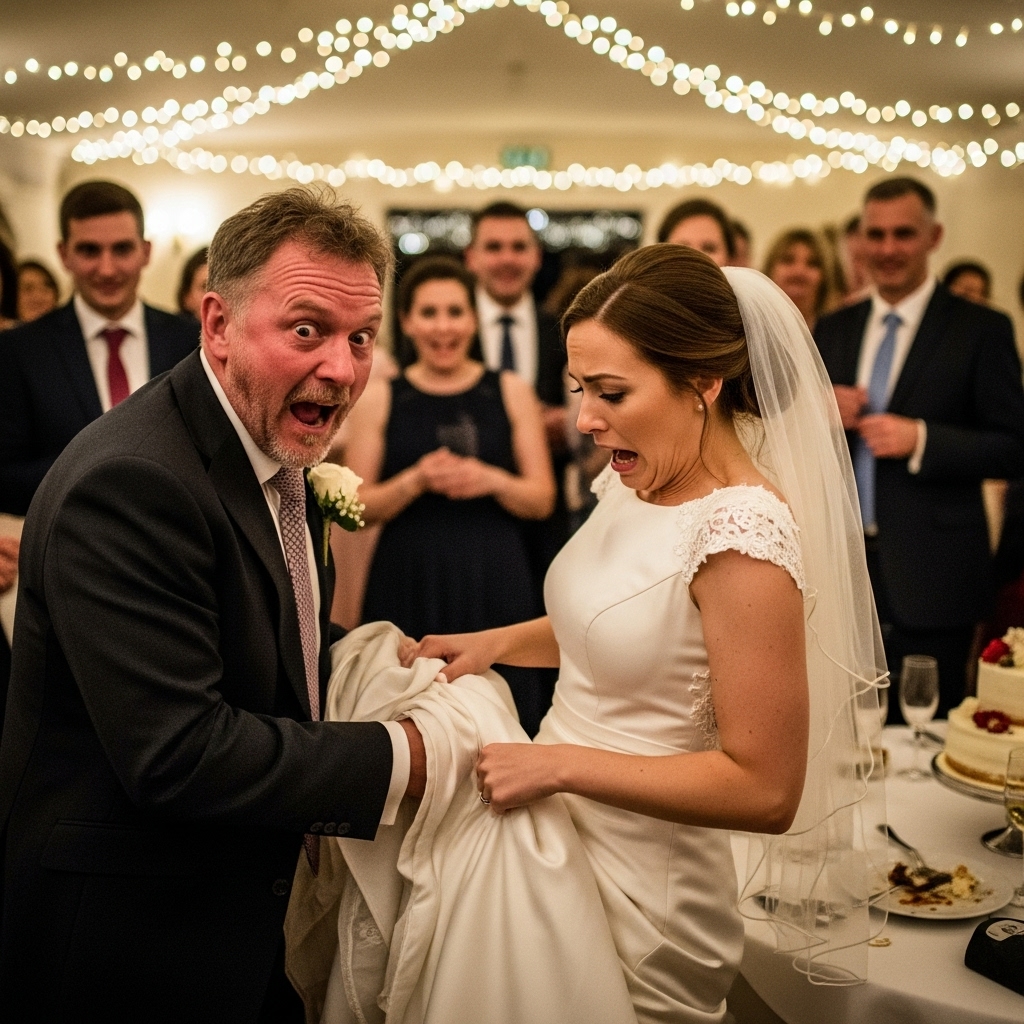 That’s when it happened. One second, we were laughing, and the next, Uncle Jack was barreling toward us like a man possessed. Before anyone could react, he dropped to his knees and lifted the hem of Madeline’s wedding dress.