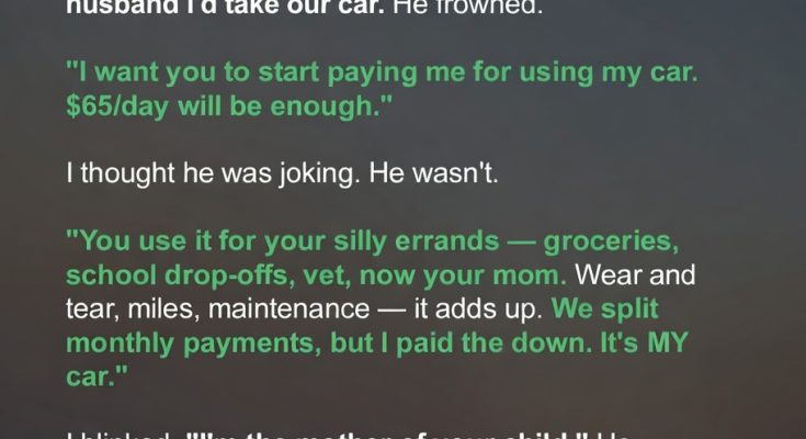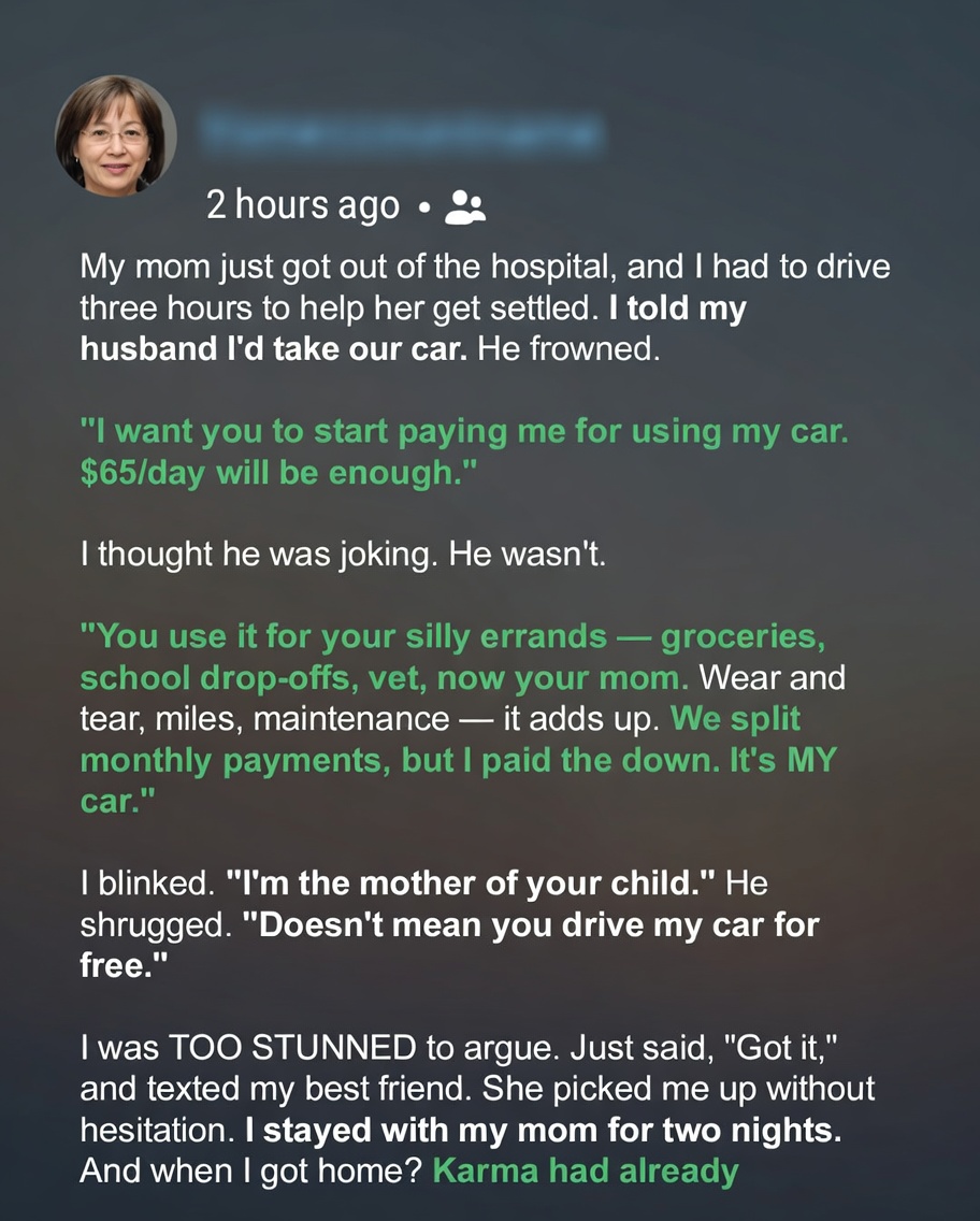 I was heading out to visit my mom after her stroke and asked to borrow my husband’s car. His response shook me: “Sure—$65 a day!” I was shattered when I realized he didn’t see me as his wife… just a roommate with a bill. But while I was gone, karma delivered a lesson he won’t forget.