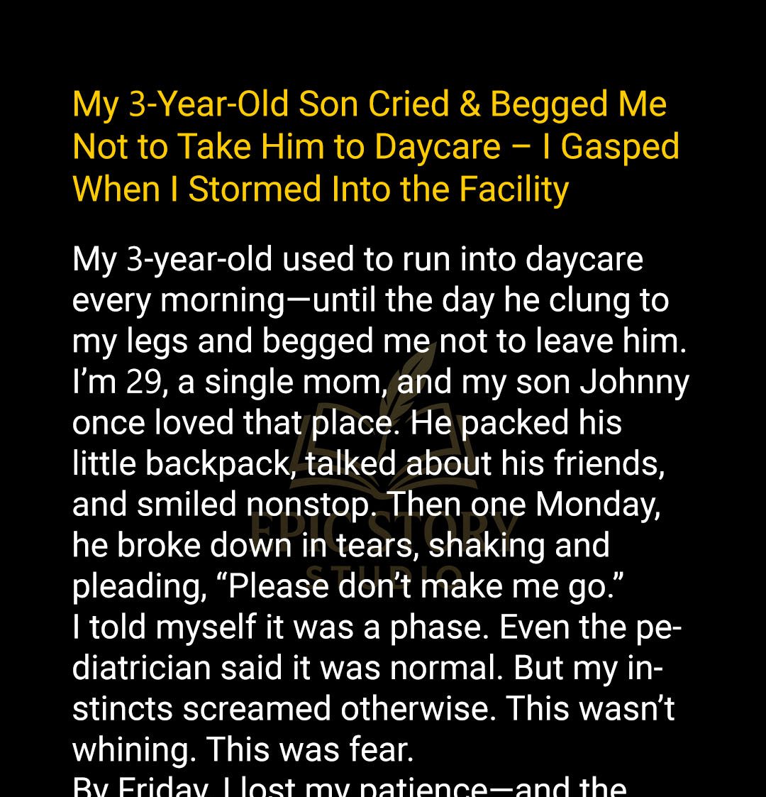 “Daycare!” he sobbed, his voice breaking on the word as he moved to cling to my legs. “Please don’t make me!”