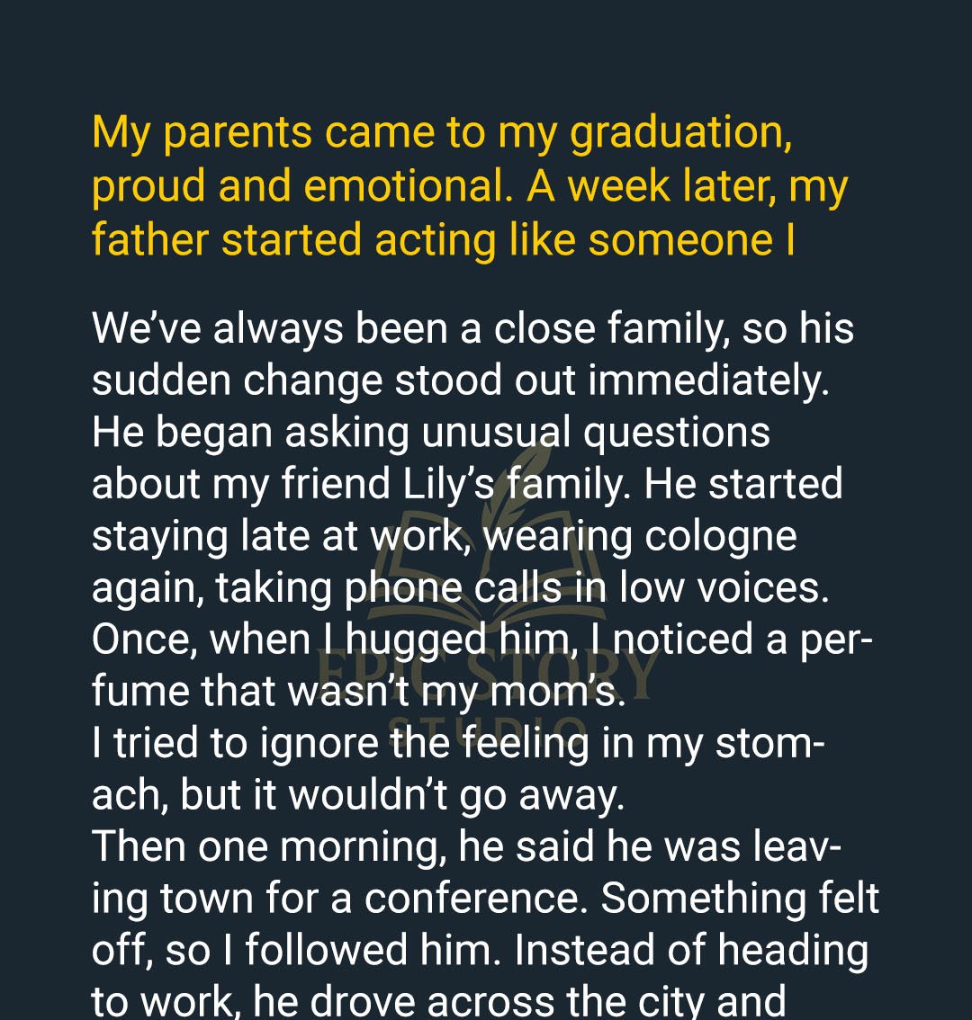 When Chloe noticed her father’s strange behavior after graduation, every sign pointed to betrayal. Secret phone calls, late nights, and visits to her best friend’s divorced mother. But when the truth finally surfaced, it wasn’t an affair at all. What was he really hiding?